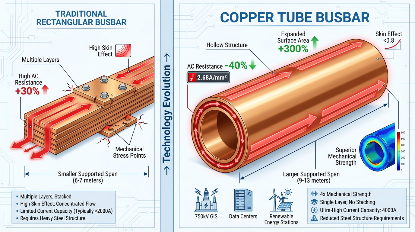 Ez a szerkezeti forradalom közvetlenül foglalkozik az ultranagy áramú átvitel fájdalmas pontjaival. A 750 kV-os gázszigetelt kapcsolóberendezésekben (GIS) egy Φ100 × 5 mm-es rézcsöves gyűjtősín 4000 A áramot képes szállítani, áramsűrűsége pedig csak 2,68 A/mm². Ezzel szemben az egyenértékű téglalap alakú gyűjtősínek megkövetelik több egymásra helyezett réteg , ami több mint 30%-os veszteségnövekedést eredményez. Ami még kritikusabb, a rézcsöves gyűjtősínek mechanikai szilárdsága négyszerese a téglalap alakú gyűjtősínek. 50kA-es zárlati áramhatás mellett a függesztett fesztáv eléri a 9 métert, a támaszték pedig 13 méterrel, ami jelentősen csökkenti az alállomási acélszerkezetek szükségességét.