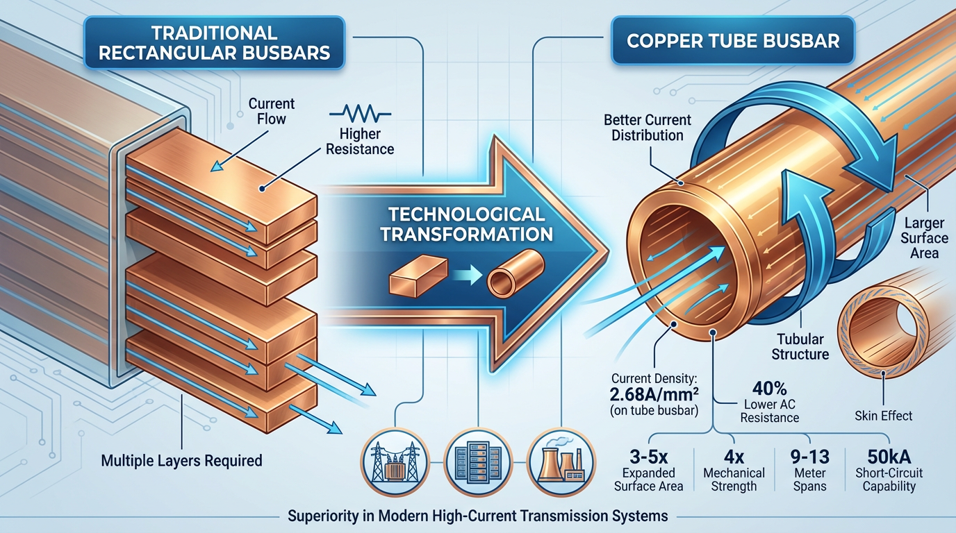 A globális energiainfrastruktúra korszerűsítése soha nem látott keresletet generál az iránt rézcső sínek. Miközben a teljes rézcsöves kereslet mindössze 2–3%-át képviselik, ezek a termékek évente 200%-ot meghaladó növekedési ütemet tapasztalnak olyan alkalmazásokban, mint az ultra-nagyfeszültségű alállomások, adatközpontok és új energiaerőművek. Az alapvető előnyük bennük rejlik üreges csőszerű szerkezet , amely 3-5-szörösére tágítja a vezeték felületét, egyenletes árameloszlást biztosít a csőfal mentén, 0,8 alá csökkenti a skin hatástényezőt, és 40%-kal csökkenti a váltakozó áramú ellenállást az egyenértékű keresztmetszetű téglalap alakú sínekhez képest.