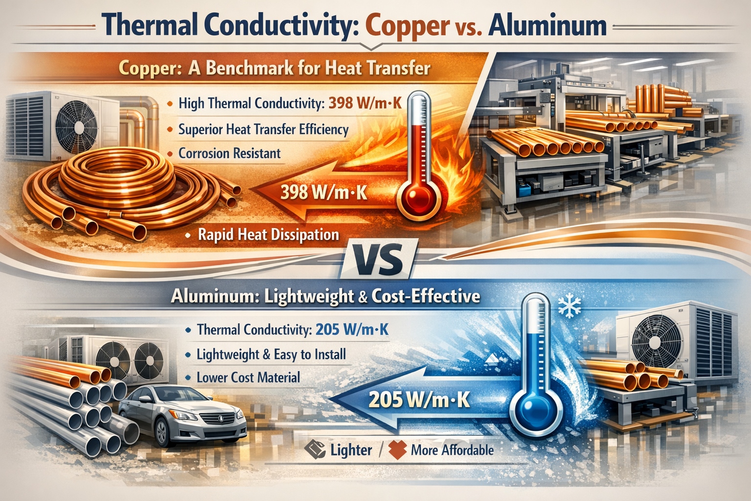 A hőcserélők, légkondicionáló rendszerek, hűtőberendezések és egyéb hőkezelési alkalmazások világában a hőátadást elősegítő csövek anyagának megválmintztása döntő jelentőségű. Réz és alumínium ezekben a rendszerekben a két leggyakrabban használt fém, különösen, ha a hőcsere hatékonyságát növelő bvagydákról és csövekről van szó. Ha azonban a teljesítményről van szó, felmerül a kérdés: melyik a jobb hőátadás szempontjából? Finom réz csövek or Alumínium csövek ?