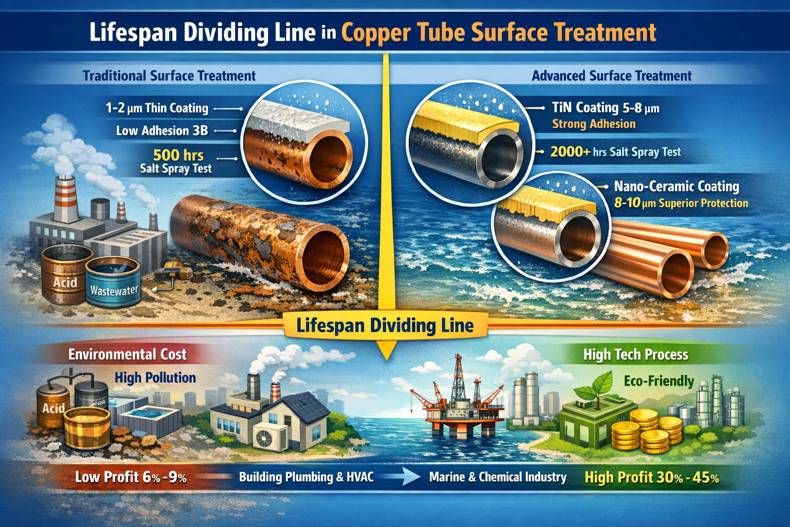 „Mindkettő az rézcsövek ben használt tengervíz sótalanító berendezés , hanem az általunk kezelt termékek hagyományos pácolás és passziválás pontszerű korróziót és szivárgást mutatott kevesebb mint 3 év alatt a tengeri környezetben; míg a versenytárs terméke, kezelve vákuumionos bevonat technológia , élettartama több mint 15 év, egységára pedig 30%-kal magasabb, mint a miénk.” Liu úr, egy qingdaói rézötvözet csöveket gyártó cég műszaki igazgatója két rész kiselejtezett és ép rézcsövet tartott fel, felfedve a felületkezelési technológia rejtett értékét. A felületkezelés, mint a rézcsőgyártás utolsó lépése, a "rozsdaeltávolítás és bevonat" egyszerű segédműveletének tűnhet, de közvetlenül meghatározza a termék minőségét. korrózióállóság, kopásállóság , és élettartam , és further impacts its market positioning and added value. Currently, most domestic copper tube manufacturers still rely on traditional surface treatment processes such as pácolás és közönséges passziválás , így termékeiket alkalmatlanná teszik az olyan igényes környezetekben, mint pl tengeri, vegyi és csúcsminőségű vízkezelés ; néhány cég azonban frissítette a sajátját finomított felületkezelési technológiák , lehetővé téve a rézcsöveik stabil teljesítményének fenntartását extrém környezetben, és könnyedén megragadják a csúcskategóriás piacot. ez a vékony" védőfólia " olyan alapvető részletté válik, amely megkülönbözteti a rézcsöves termékek versenyképességét, és ez jelenti a kulcsot ahhoz, hogy az iparág a "minősített"-ről a "kiváló minőségűre" váljon.