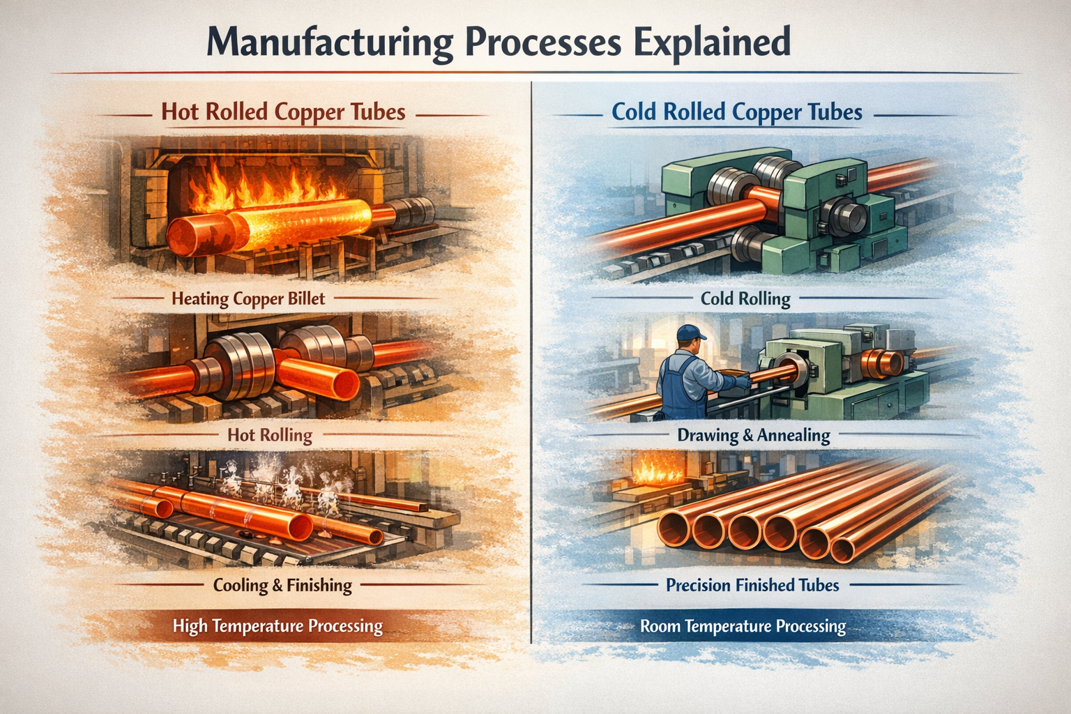 A gyártási folyamat a hidegen hengerelt és melegen hengerelt rézcsövek teljesítménybeli különbségeinek alapja. Egy képzett rézcsőgyár jellemzően mindkét lehetőséget kínálja a különféle piaci igények kiszolgálására.