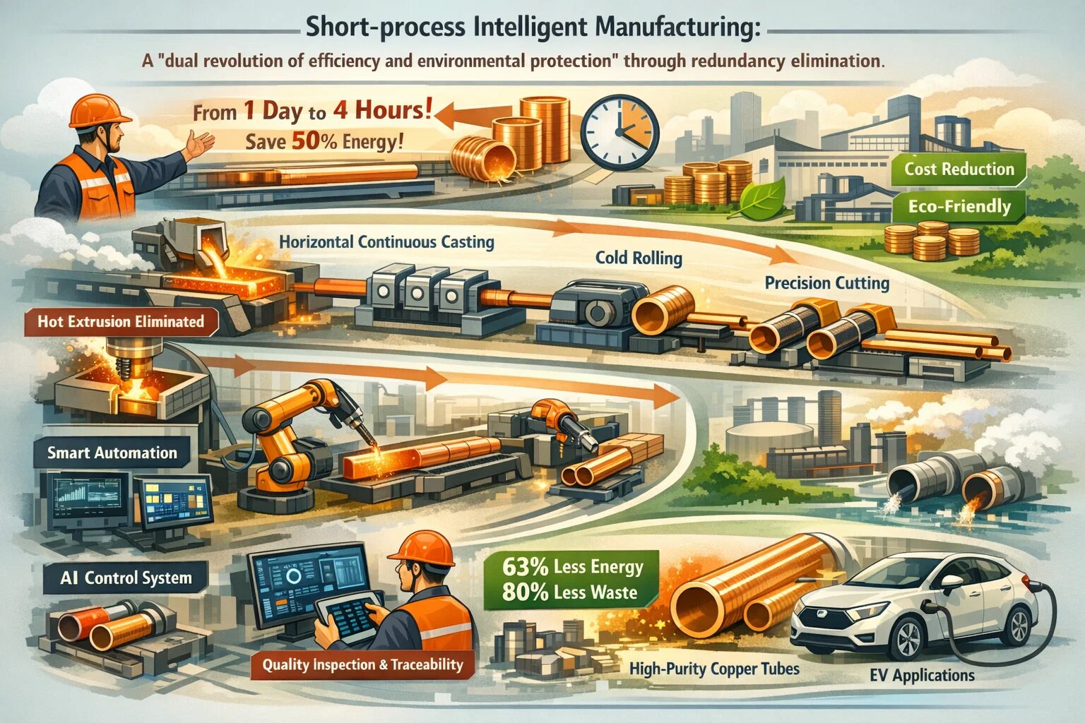 „Korábban egy teljes napba telt egy adag precíziós rézcsövek elkészítése, de most mindössze 4 óra alatt szállítjuk őket, és ezzel a felét megtakarítjuk az áramnak!” – mondta a Jiangsu állambeli Taicangban található JinXin Copper Tube műhely vezetője a teljesen automatizált gyártósorra mutatva. 2025-ben a vállalat és a Central South University által közösen kifejlesztett "rövid eljárású rézötvözet csövek gyártási technológiája nemzeti szintű minősítést kapott. Ez az extrudálás nélküli „üreges bugák vízszintes folyamatos öntése – hideghengerlés – húzás” teljesen forradalmasította a hagyományos gyártási módszereket.