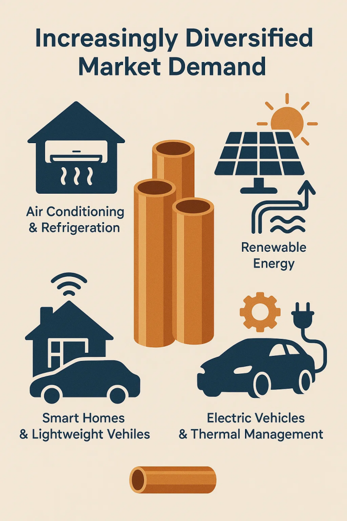 A rézcső -ipar piaci kereslete szintén jelentős változásokon megy keresztül. A globális éghajlatváltozással és a növekvő környezeti tudatossággal növekszik a rézcsövek iránti kereslet a légkondicionálásban, a hűtésben és a megújuló energiában. Különösen az új energiaágazatban a rézcsövek, kiváló hővezetőképességük és korrózióállóságuk miatt, kulcsfontosságú anyaggá váltak olyan energiaeszközökben, mint a napenergia és a geotermikus energia.