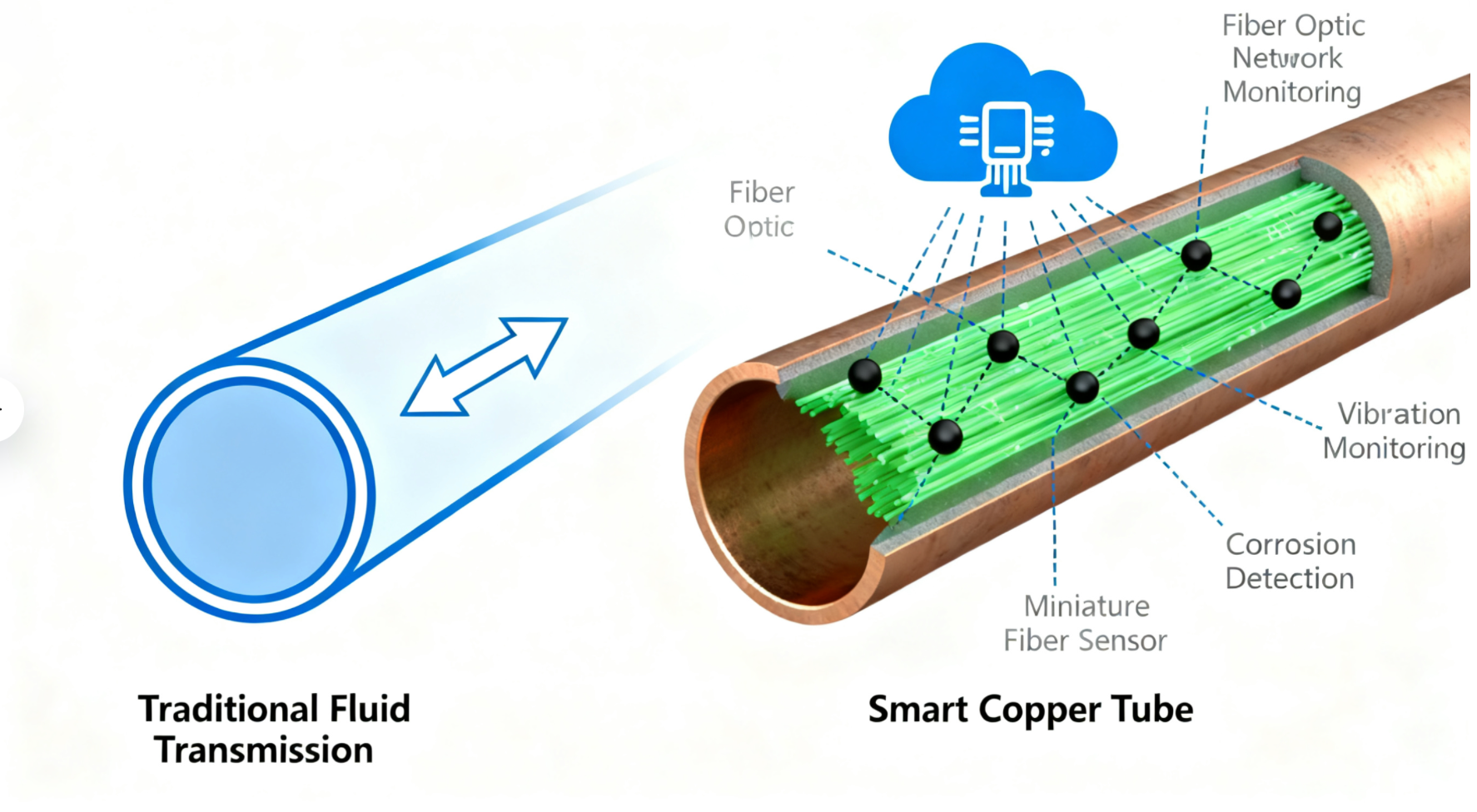 (Felirat: A passzív csőből az aktív érzékelővé: A rézcső szerepének alapvető evolúciója, az anyagok puszta vezetőjéből a működési intelligencia generátorává és továbbítójává.)