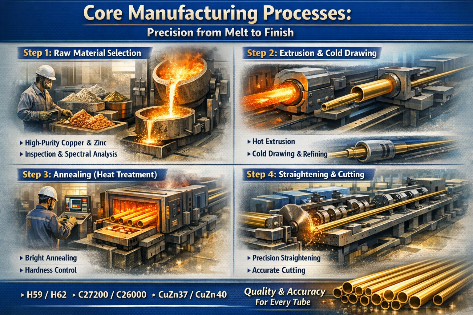 Az átláthatóság a bizalom alapja a B2B partnerségekben. Egy professzionális sárgaréz csőgyár nem csak csöveket "készít"; szigorú, tudományosan ellenőrzött sorrendet követ annak érdekében, hogy a termék minden millimétere megfeleljen a nemzetközi szabványoknak.