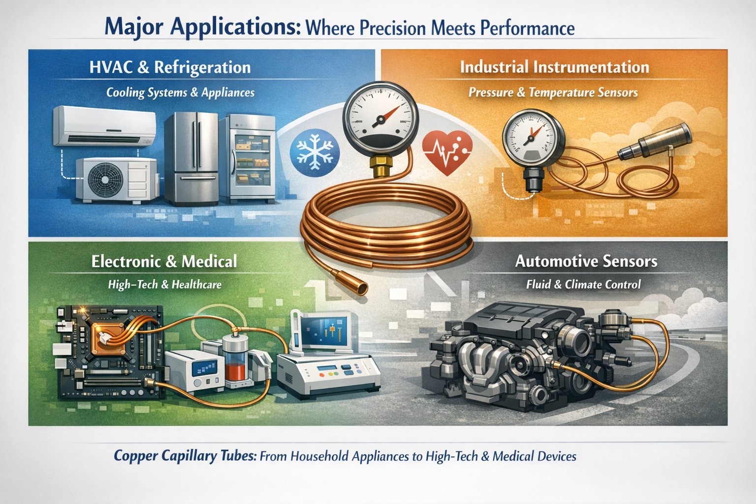 A rézkapilláris csövek rendkívül pontosan szabályozzák a folyadékáramlást, a háztartási készülékektől az életmentő orvosi berendezésekig mindenben megtalálhatók.