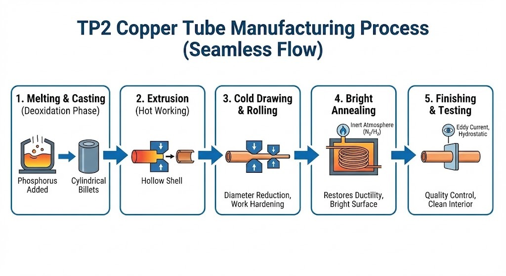 A TP2-es rézcsövek gyártása egy utazás a magas hőfokon történő olvasztástól a nagy pontosságú hidegmegmunkálásig. A legtöbb prémium TP2 csövet úgy gyártják varrat nélküli csövek , amely kiküszöböli a hegesztési varrat meghibásodásának kockázatát.