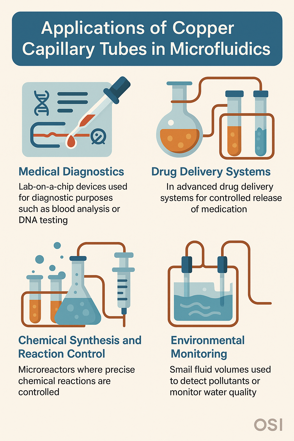 A sokoldalúsága réz kapilláris csövek lehetővé teszi a különféle mikrofluidikai alkalmazásokban való felhasználásukat. A legjelentősebb területek, ahol ezeket a csöveket használják, a következők: