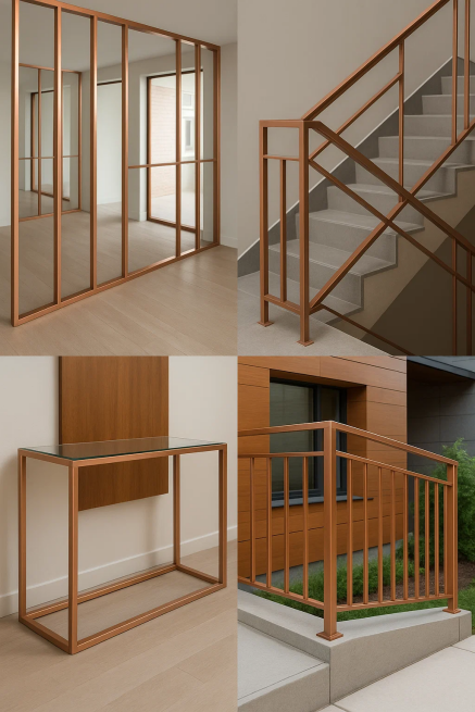 Egyes esetekben a négyzet alakú rézcsöveket más anyagokkal, például üveggel vagy fával kombinálják, hogy egyedi és dinamikus mintákat hozzanak létre, amelyek a textúrával és a fénnyel játszanak. Modern, minimalista környezetben, valamint hagyományosabb kivitelben egyaránt használhatók, bemutatva rugalmasságukat a különféle stílusokhoz való alkalmazkodásban.